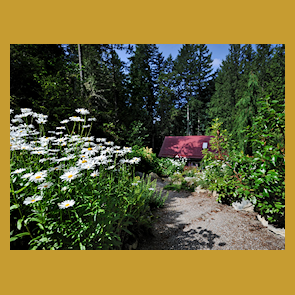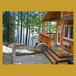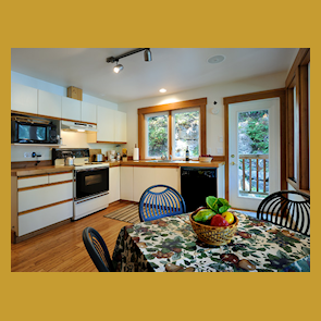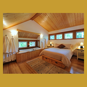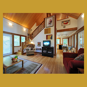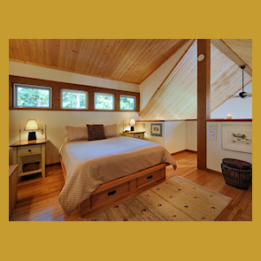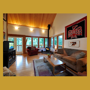Moon Dance Cabin is a classic west coast design with a wrap around porch, just steps from the water. A home away from home featuring vaulted pine ceilings, bamboo flooring and rich cedar trim throughout it is ideal for a couple with the open loft design. There is also a queen size sofa bed in the living area.