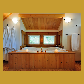 Soaker tub for two with views of the water, forest and rockery. Cotton robes for two.